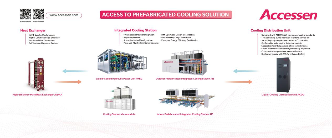 艾克森的低碳綠色數(shù)據(jù)中心解決方案,以預(yù)制化集成和板式換熱技術(shù)為核心,包括箱式預(yù)制化集成冷站、液冷水力模塊和箱式微模塊集成冷站、AHRI認(rèn)證板式換熱器和液冷分配單元ACDU等產(chǎn)品的組合,助力客戶實(shí)現(xiàn)低碳交付、快速高質(zhì)量部署水冷和液冷數(shù)據(jù)中心基礎(chǔ)設(shè)施,為智慧化低碳運(yùn)營,成為高標(biāo)準(zhǔn)綠色算力基礎(chǔ)設(shè)施,支持企業(yè)客戶及大規(guī)模云計(jì)算布局提供可靠保障。