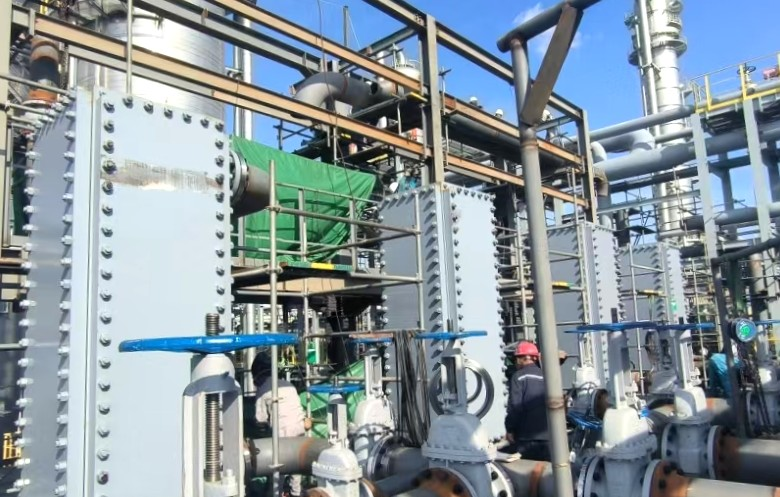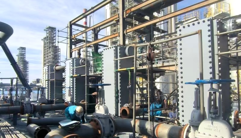 連續(xù)重整裝置是大型煉化企業(yè)提高輕質(zhì)油品質(zhì)量和產(chǎn)量的關(guān)鍵裝置之一,其液化氣分離單元脫異丁烷的塔頂冷凝器產(chǎn)品素有石化領(lǐng)域換熱設(shè)備的"皇冠"之稱,長期被外資廠家壟斷且生產(chǎn)交貨周期長。該設(shè)備除需滿足苛刻的換熱能力和制造工藝的要求外,還需要在僅有的空間內(nèi)兼顧能力提升和結(jié)構(gòu)緊湊的現(xiàn)場安裝。經(jīng)過前期多次的技術(shù)交流和方案探討后,充分考慮到換熱介質(zhì)異丁烷易燃易爆性,確認(rèn)艾克森的全焊接板式換熱器可以應(yīng)對此挑戰(zhàn)。項(xiàng)目最終選用了4臺A-BLOC四面可拆全焊換熱器,該設(shè)備兼具換熱效率高、結(jié)構(gòu)緊湊、易清洗、性能穩(wěn)定和安全可靠等優(yōu)勢。設(shè)計(jì)平均溫差僅6.94℃,解決了傳統(tǒng)管式換熱器無法處理這么小溫差換熱,能適應(yīng)循環(huán)水不同季節(jié)的溫度變化滿足最不利工況的換熱;異丁烷液相導(dǎo)熱系數(shù)僅0.12W/m℃,傳熱難度大同時(shí)還要保證很小的壓降,不等流道板片設(shè)計(jì),匹配氣液比例變化,傳熱系數(shù)比管式換熱器提升2.8倍;奧氏體不銹鋼SMO254配合全自動(dòng)激光焊接工藝,保證了板片不易變形和高可靠性,焊接深度比高、焊縫強(qiáng)度高且美觀;加厚框架與化工級防腐噴涂設(shè)計(jì)有效降低框架銹蝕風(fēng)險(xiǎn),保障設(shè)備20年以上長效穩(wěn)定運(yùn)行。